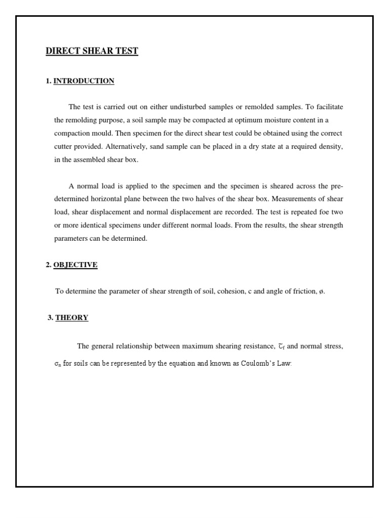 This test is to determine the shearing strength of soil using the direct shear apparatus. The laboratory report cover the laboratory procedures for determining these values for cohesionless soils. Assemble the shear box as indicated in.